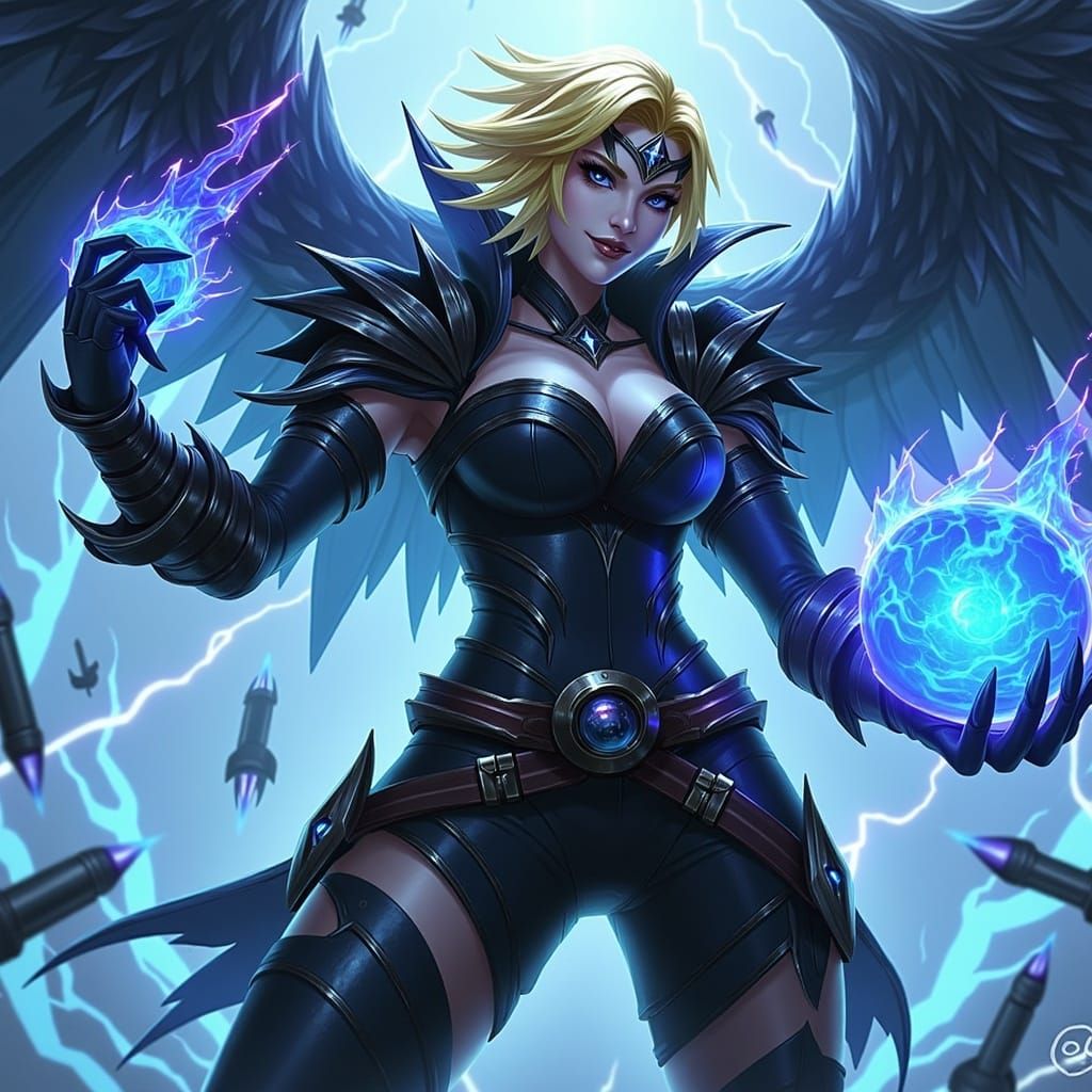 A striking picture of a blonde warrior in a dieselpunk-style leather costume. She holds a crackling blue energy ball, with rockets and lightning swirling around her, and black wings on her back. The image blends futuristic and gothic aesthetics.