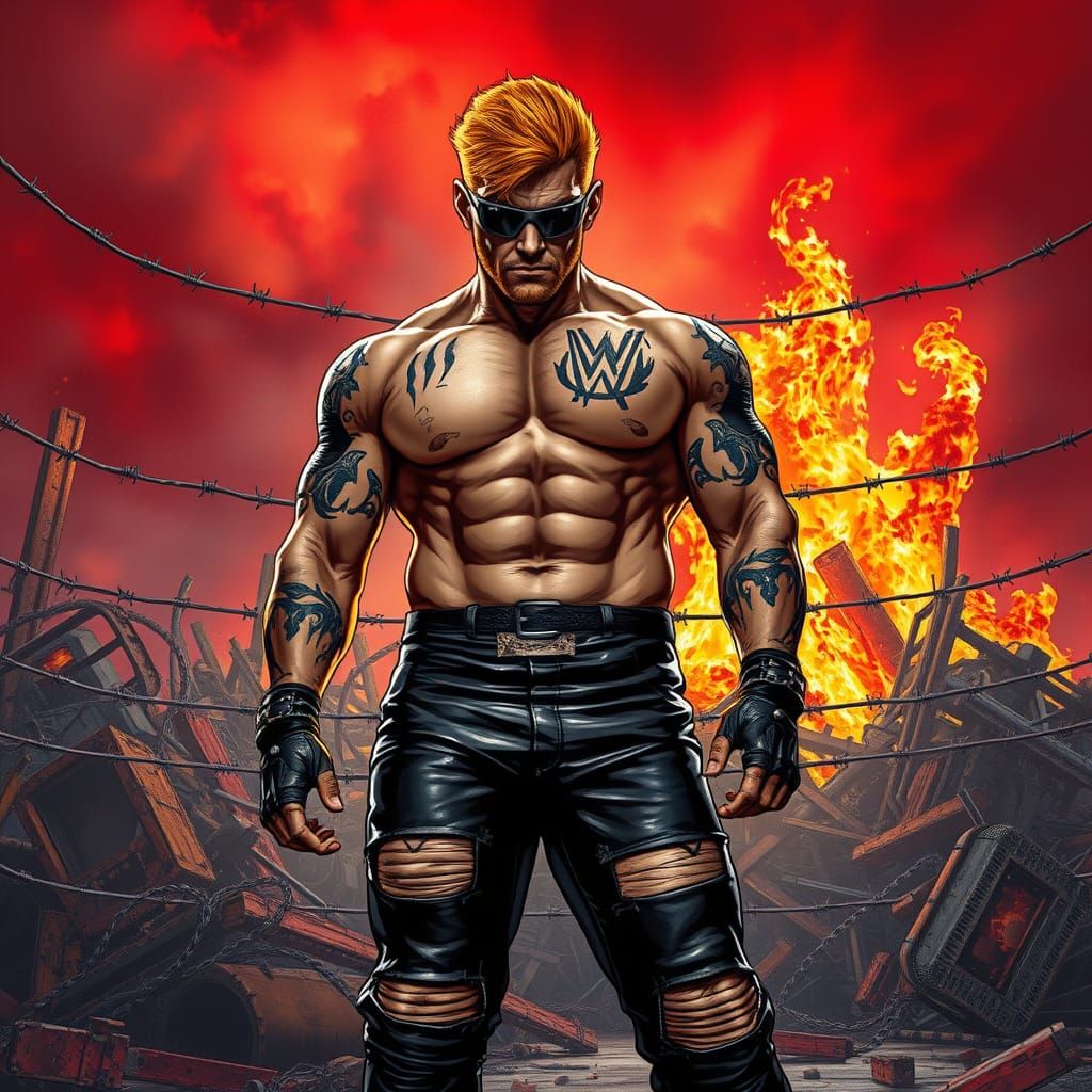This image shows a muscular, ginger-haired wrestler standing defiantly in a flaming, barbed-wire arena. The scene is rendered with bold, cinematic lighting and gritty textures, in a dark fantasy style.