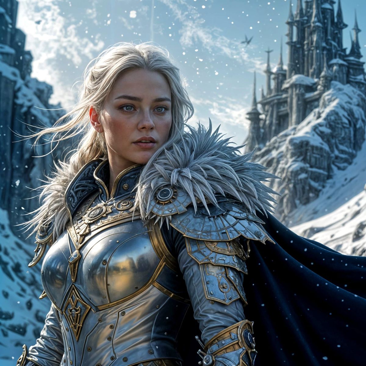 vivid colours, realistic epic image of Elsa warrior princess , long white hair blowing in the wind snow falling from the sky, from the series Frozen, ice world dominated image with magic and light , ice realm and snow and ice world with large epic ice castle in the background , crystals