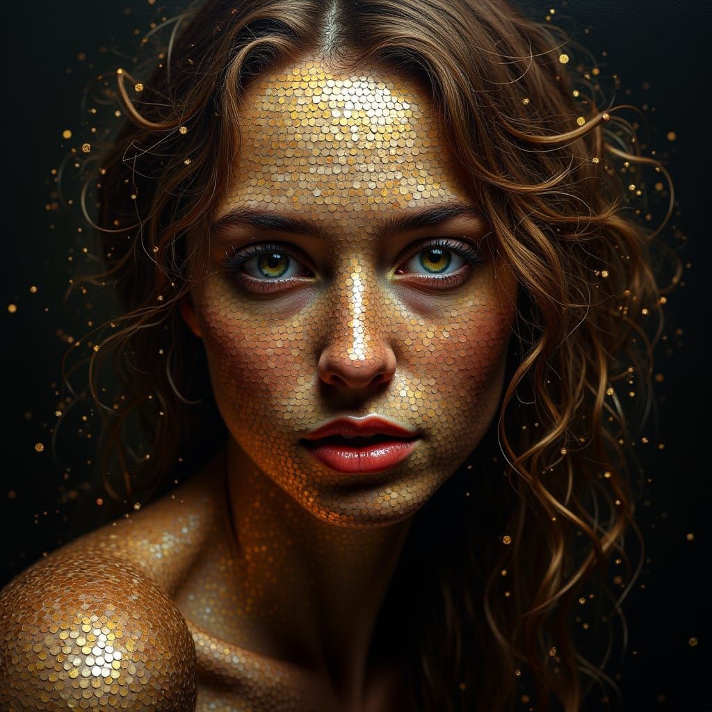 A striking portrait of a woman composed entirely of shimmering coins, detailed with dramatic light and shadow. Rendered in a Baroque oil painting style with chiaroscuro.