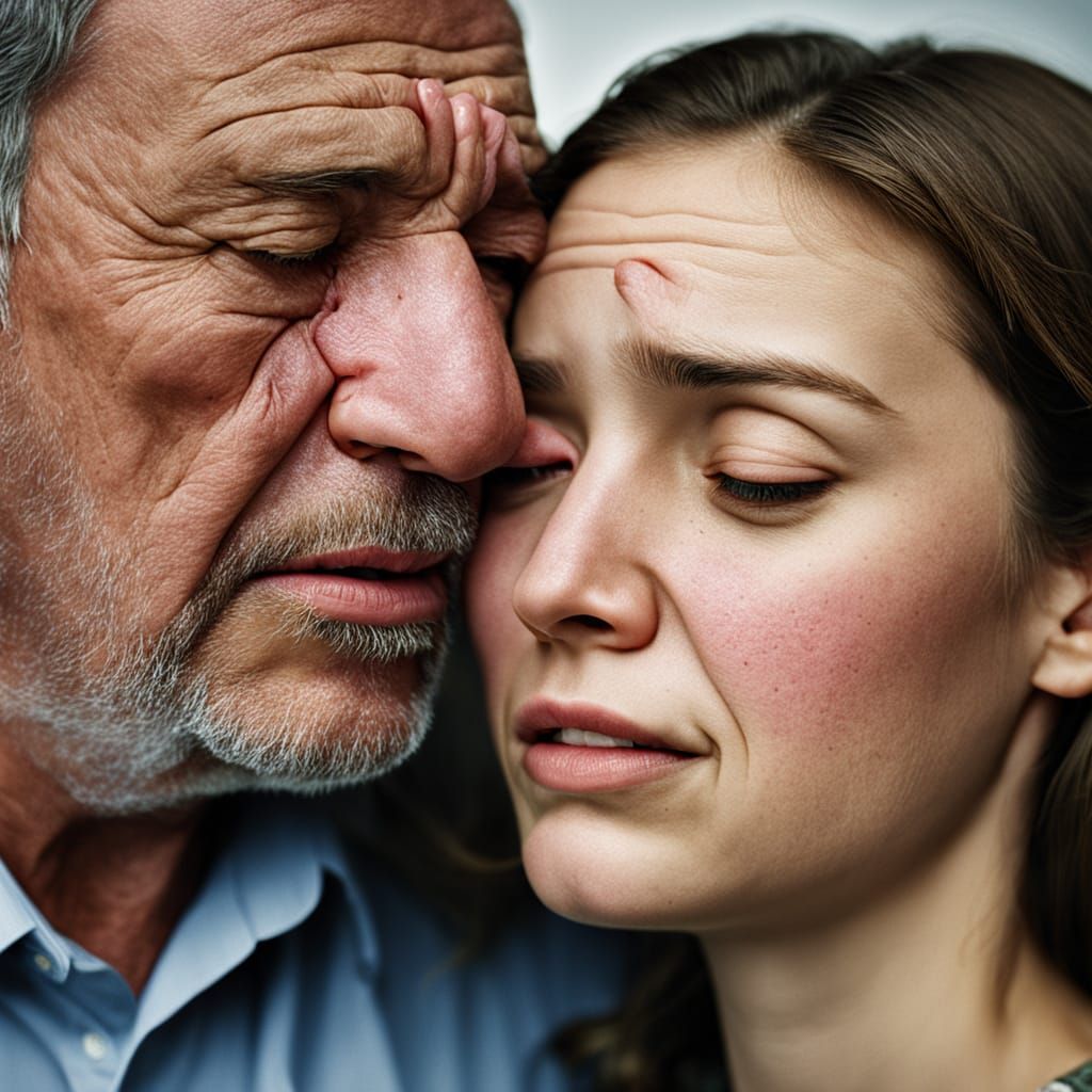 A close-up portrait of a young girl crying on her father's shoulder, captured in a warm and intimate studio setting with soft bokeh and vibrant colors.