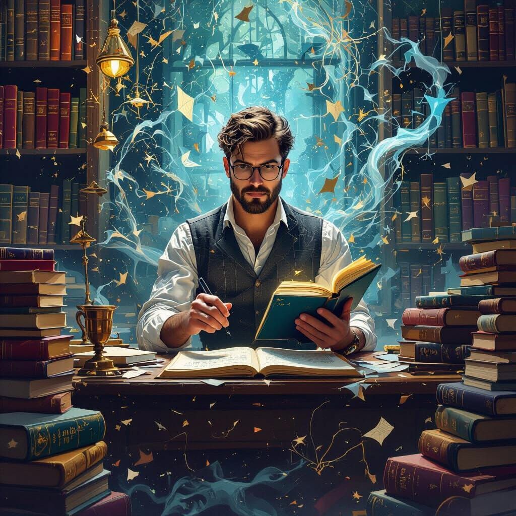 This image shows a teacher in an academic environment, teaching ethics and professional conduct. The scene is a detailed matte painting with deep colors and intricate details, reminiscent of fantasy concept art.