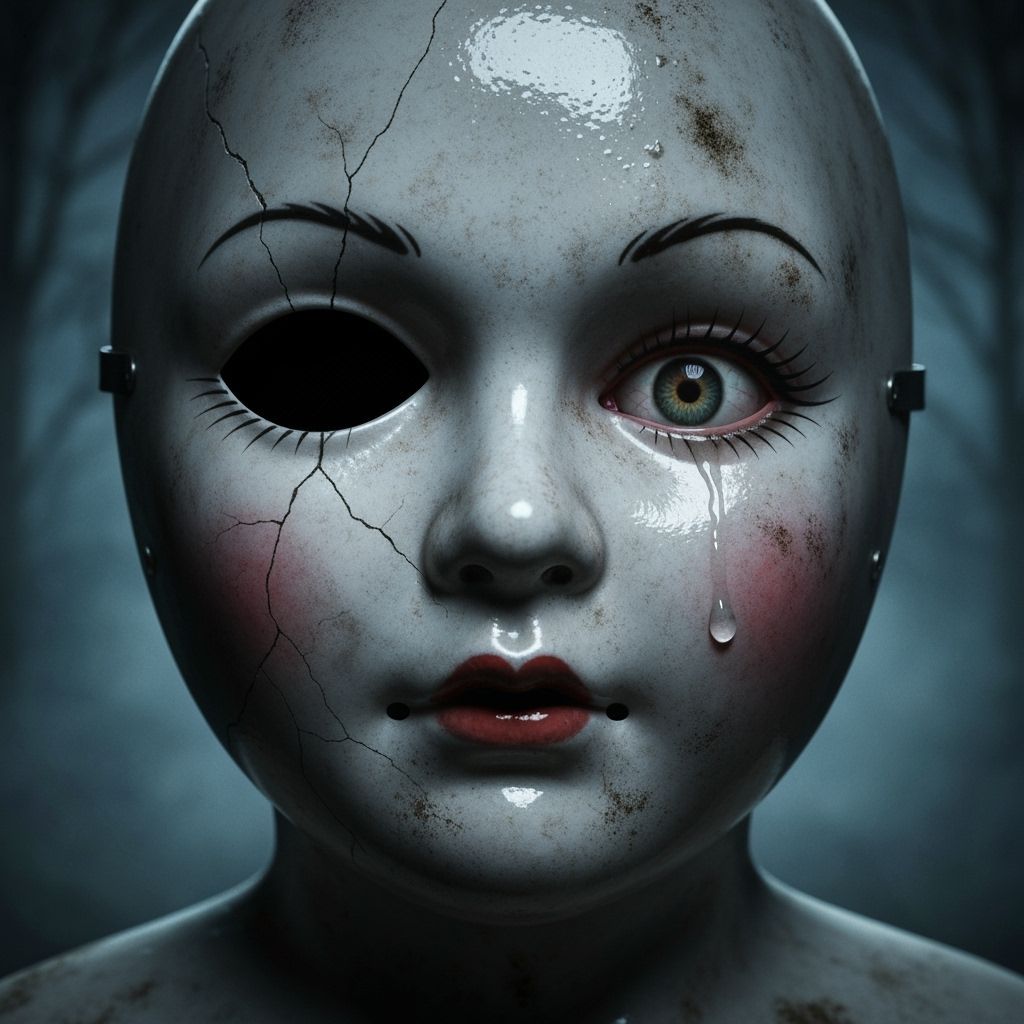 A hyperrealistic image captures a trick-or-treater in a vintage porcelain doll mask, one eye dark, the other peering out. Moody lighting and a misty background create an unsettling Halloween scene.