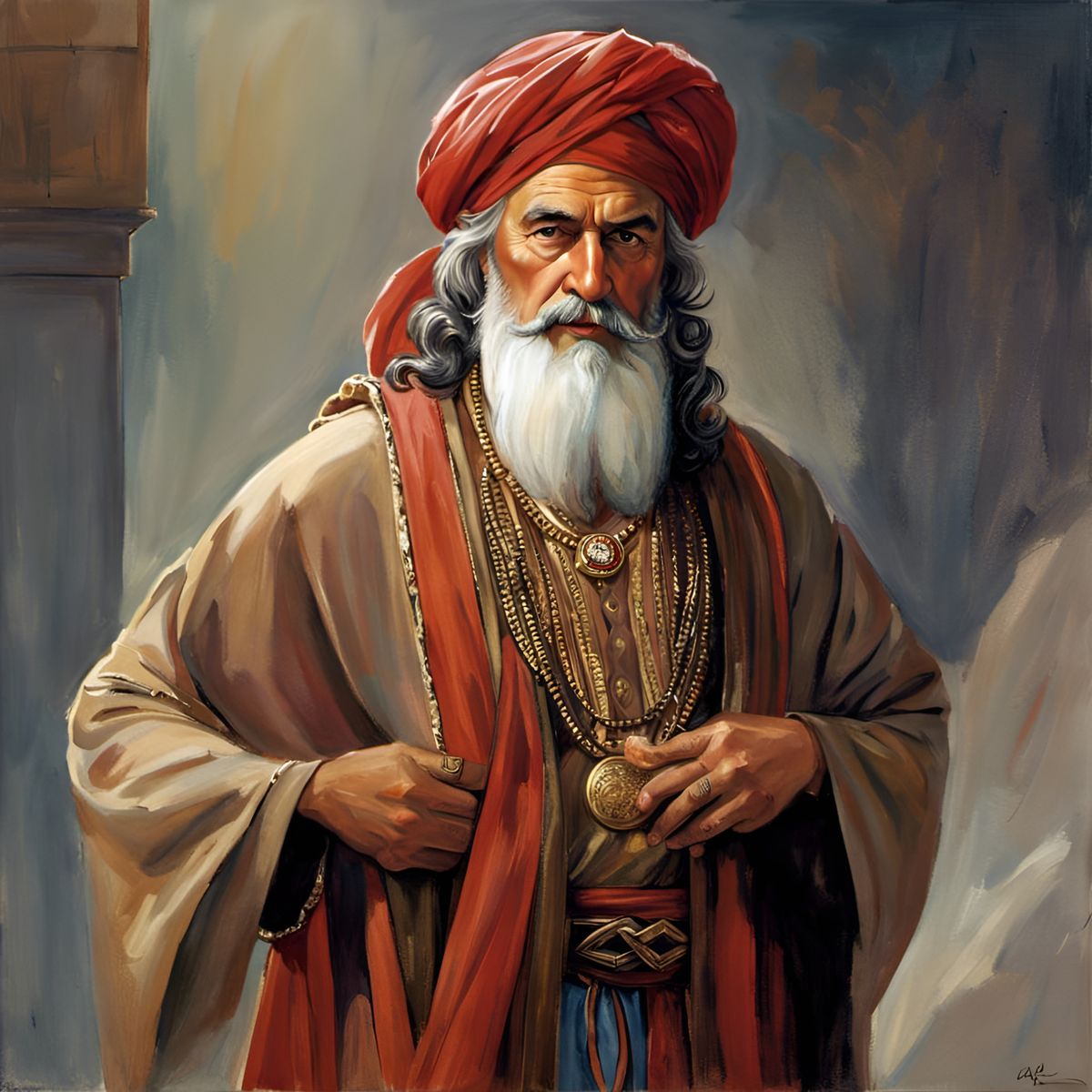 A watercolor painting shows a muscular, elderly Middle Eastern man in a silk kaftan and turban. The full-bodied portrait captures his intellectual, handsome face with remarkable detail in a fantasy setting.
