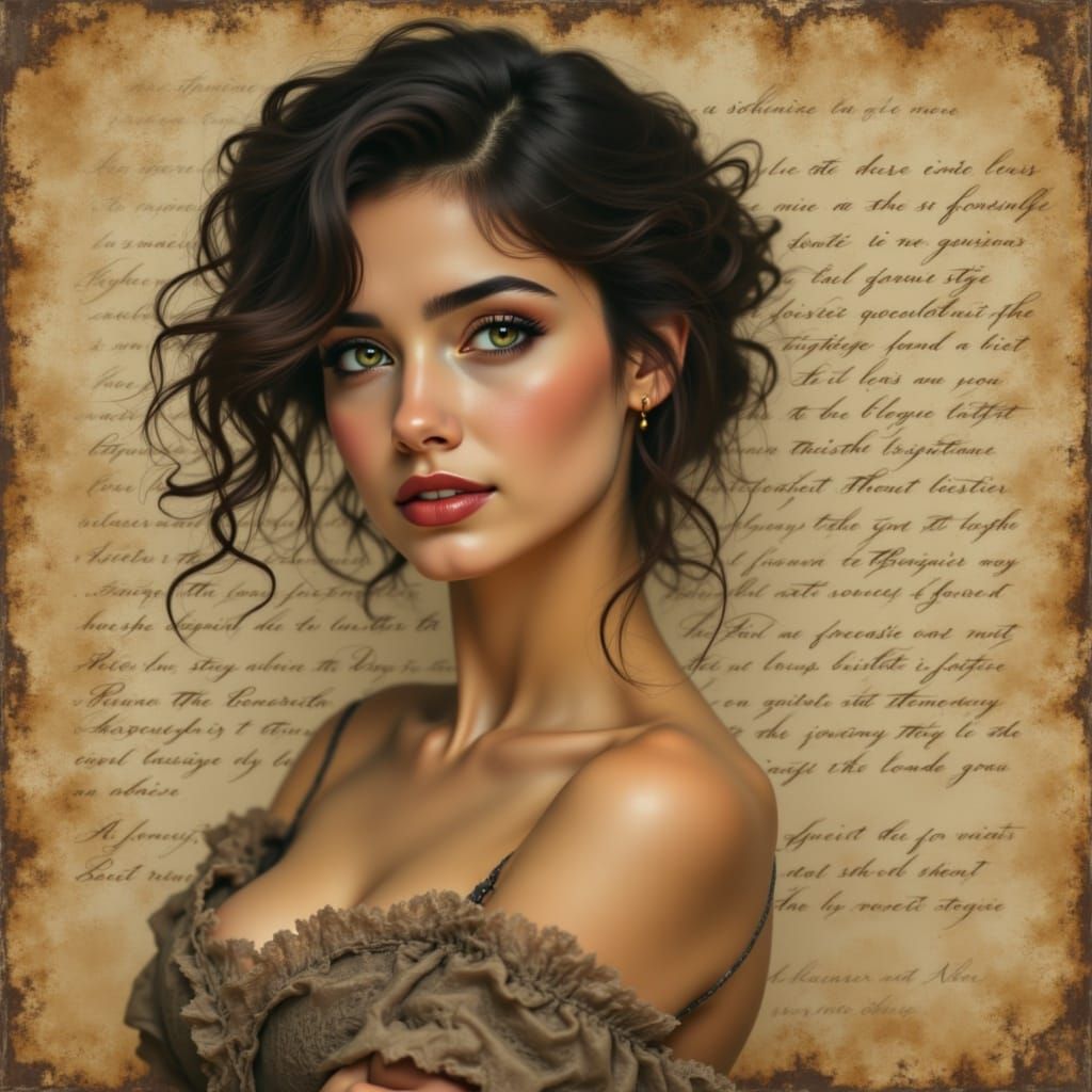 A photorealistic portrait of a stunning young woman in a vintage, fantasy setting, with a French handwriting background and intricate details, captured in warm sepia tones.