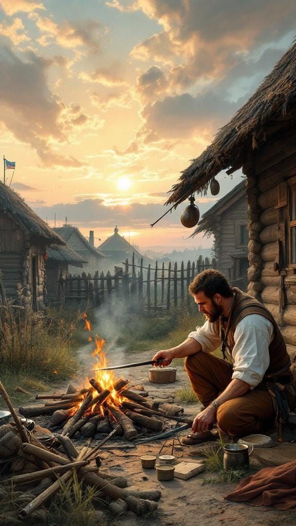 A picturesque scene of Cossack men engaged in daily life at sunrise. They are dressed in traditional attire and are set against a backdrop of wooden huts and a palisade fence, rendered as historical illustration.