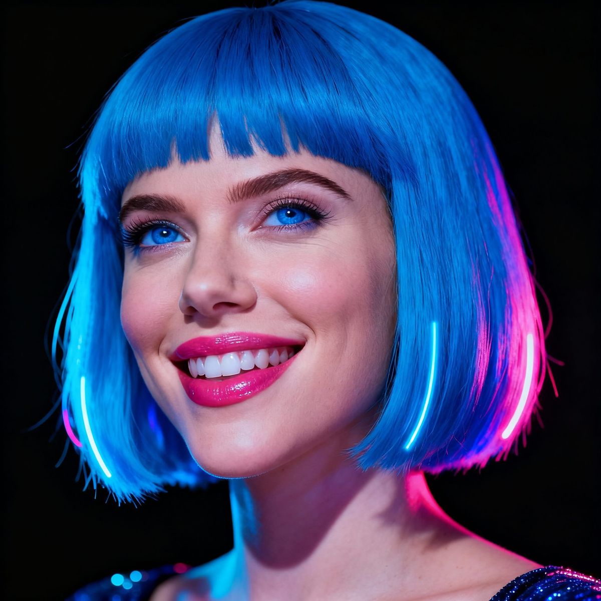 A photorealistic portrait featuring a woman with an electric blue bob, intense blue eyes, and a bright smile. Cinematic lighting creates dramatic shadows and highlights, with neon accents on a black background for a glamorous synthwave feel.
