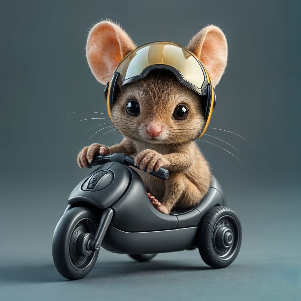 A hyperrealistic image of a computer mouse on wheels being driven by a cute mouse. The intricate details bring this adorable scene to life.