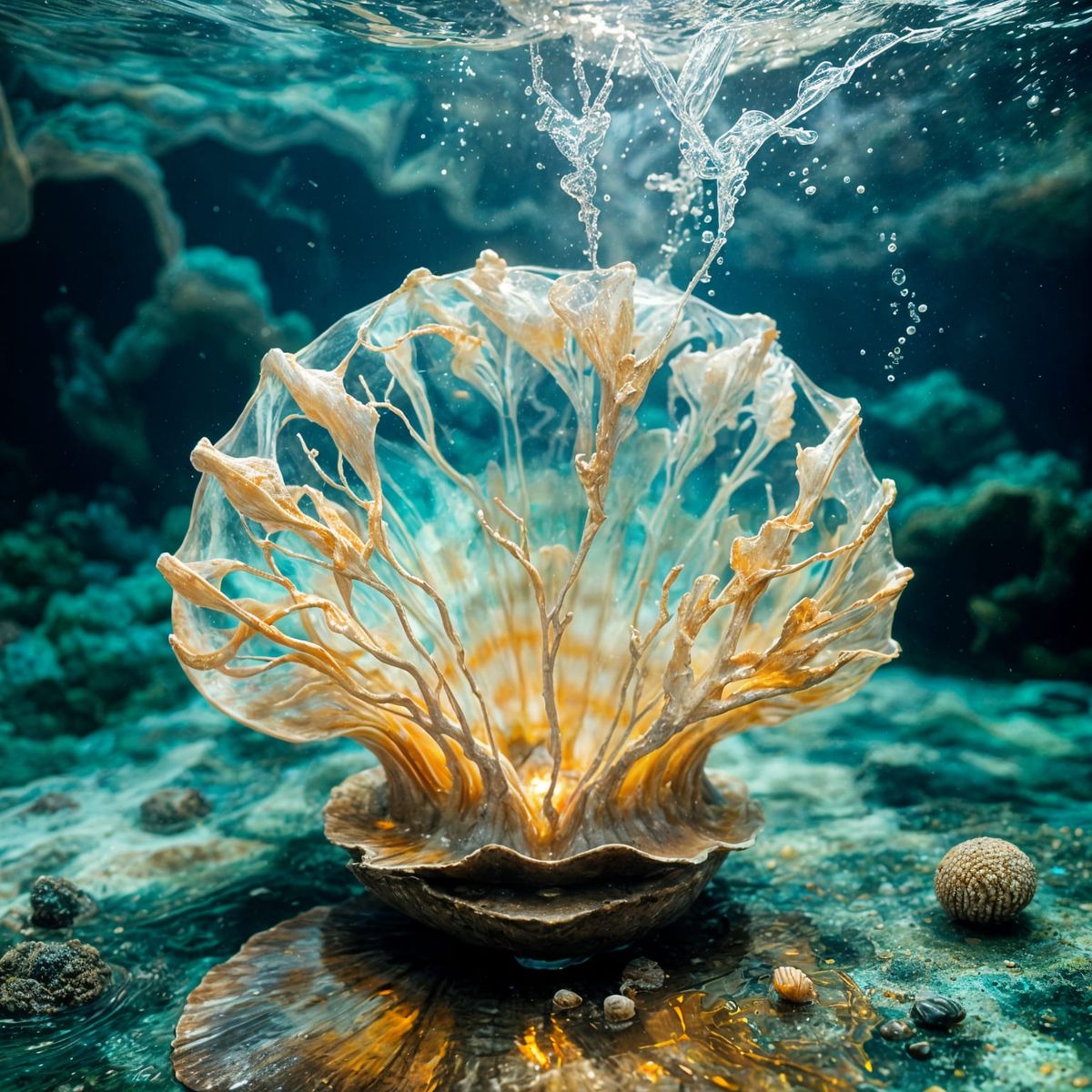 This image shows a contemporary seashell sculpture made of glowing, melted material underwater. Ethereal reflections and dappled light enhance the vibrant blues and greens.