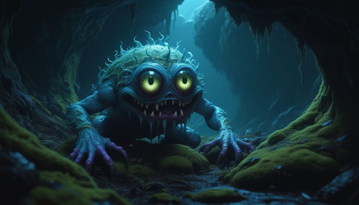 This dark fantasy image features a cowering monster with a glowing eye, surrounded by vibrant, swirling patterns of moss and lichens in a mystical cave setting.