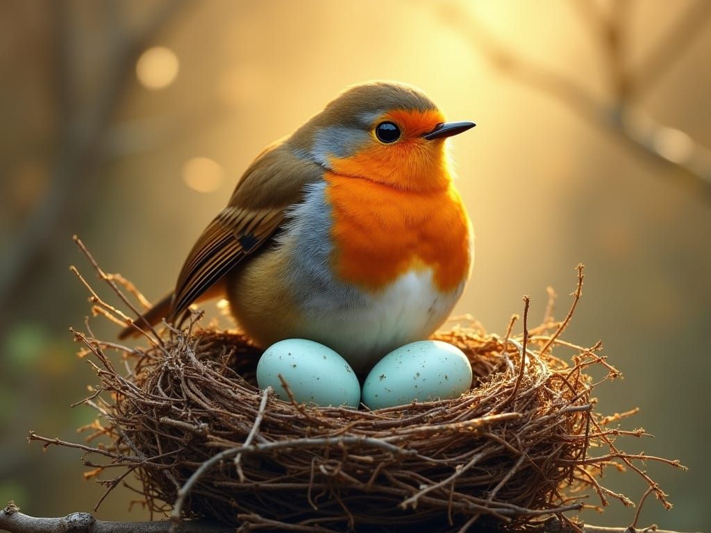 This beautiful painting showcases a majestic robin in her intricately woven nest, surrounded by delicate eggs and lush foliage, rendered with meticulous detail and warm, earthy tones.