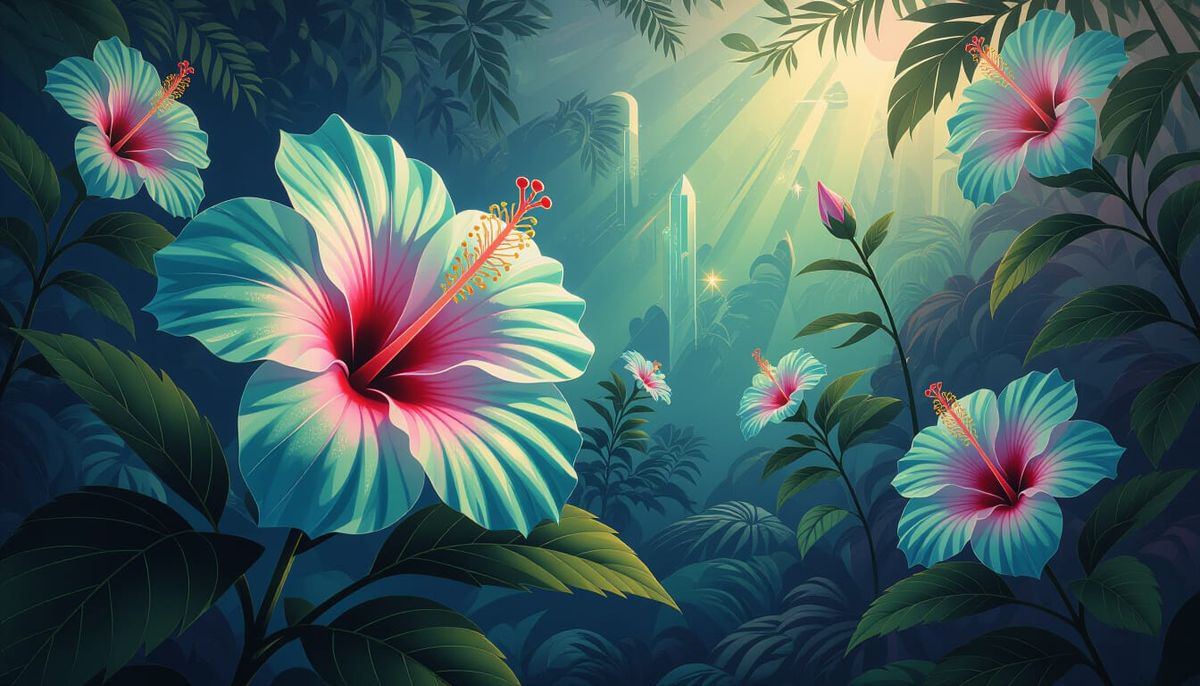 A surreal image of luminous crystal hibiscus flowers in a futuristic garden. The picture blends vibrant colors and dreamlike elements in a surrealist style.