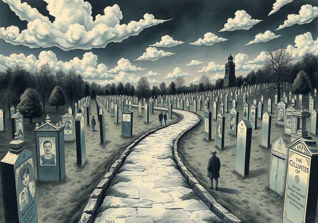 A surreal illustration of a mirrored path reflecting past lives and alternate realities. Ethereal cloud figures watch over a dreamlike cemetery that acts as a portal to other dimensions.