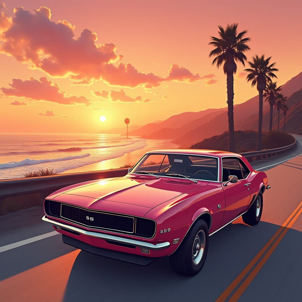 A vintage pink Camaro cruises the Pacific Coast Highway at sunset. Warm golden light creates long shadows in this retro-futuristic scene with a vibrant, dreamy landscape.