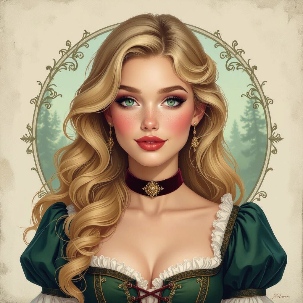 Generate beautiful blonde woman portraits with flowing curls and green-blue eyes. Free and easy AI image creation.