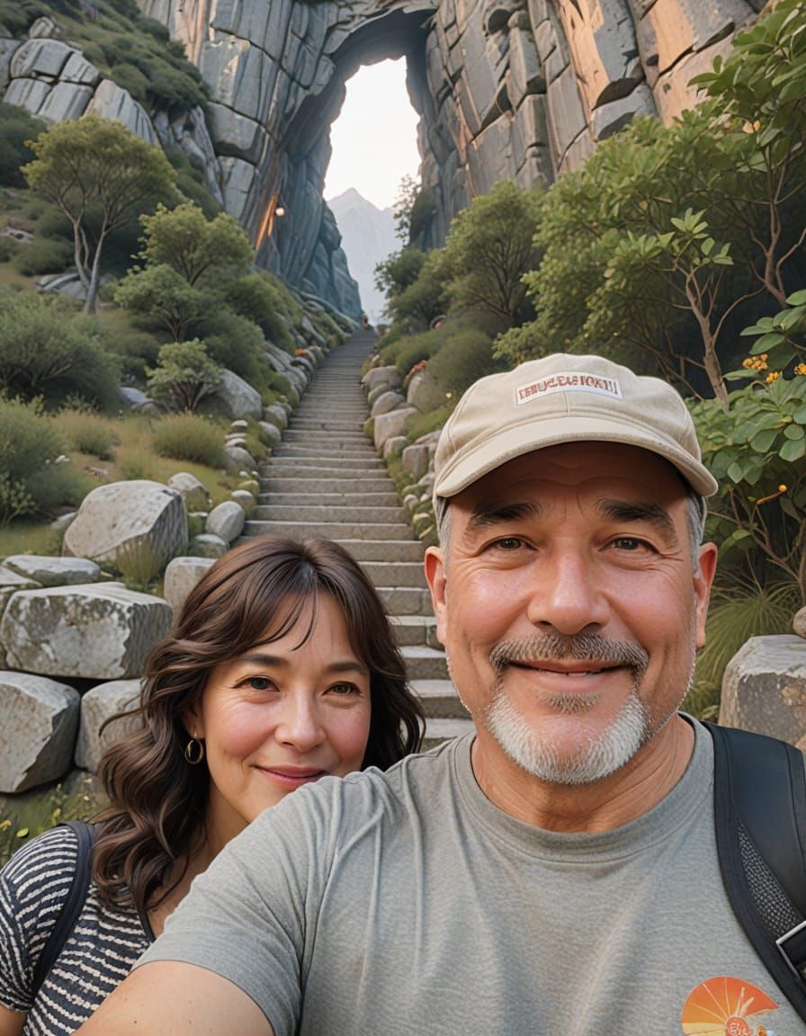 A vibrant Art Nouveau oil painting of two smiling adults posing against a scenic mountain backdrop. The image features a soft, natural light and warm, earthy tones.