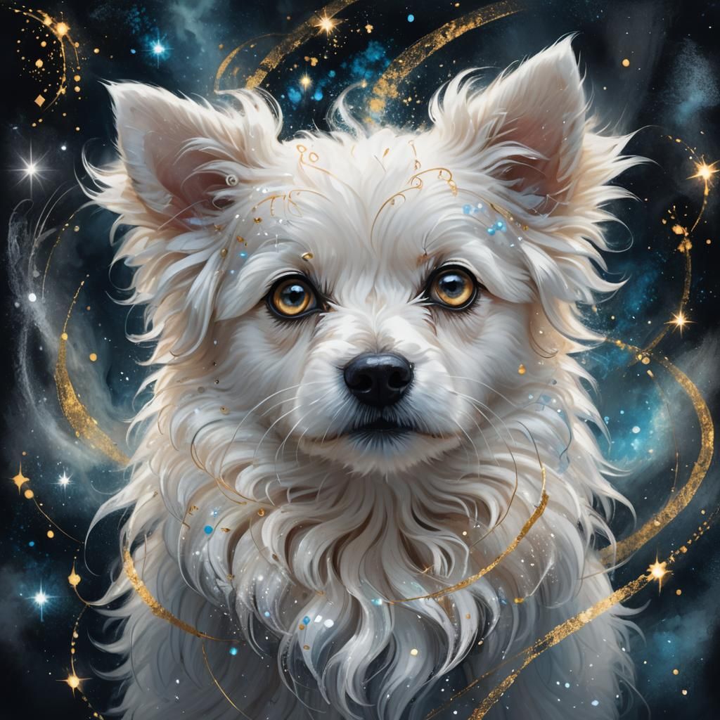 A close-up digital painting of a fluffy white dog with shining eyes, surrounded by light particles. Cosmic patterns and pastel accents create a dreamy, magical realism aesthetic with warm golden lighting.