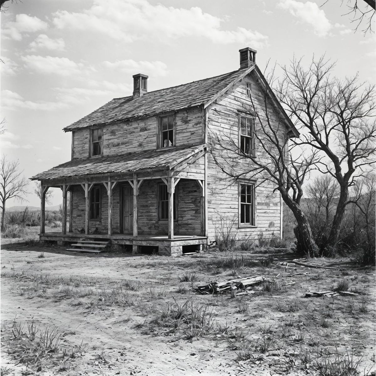 This image shows a vintage black and white photograph of an abandoned farmhouse. The desolate scene depicts a dust-covered farm in rural Oklahoma during the 1930s.