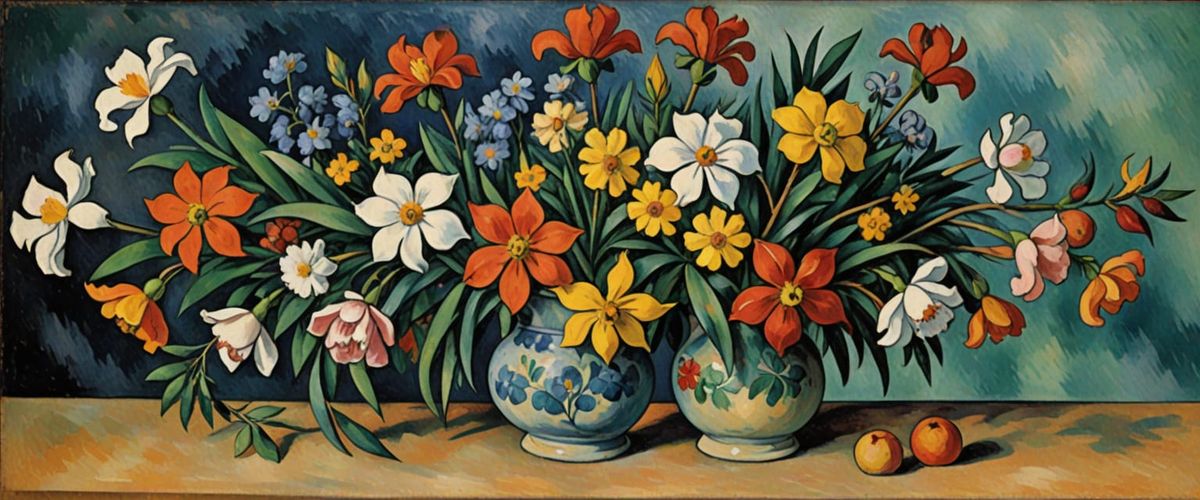 A still life arrangement of flowers in a vase, rendered in the distinct post-impressionist style of Paul Cezanne, emphasizing form and color.