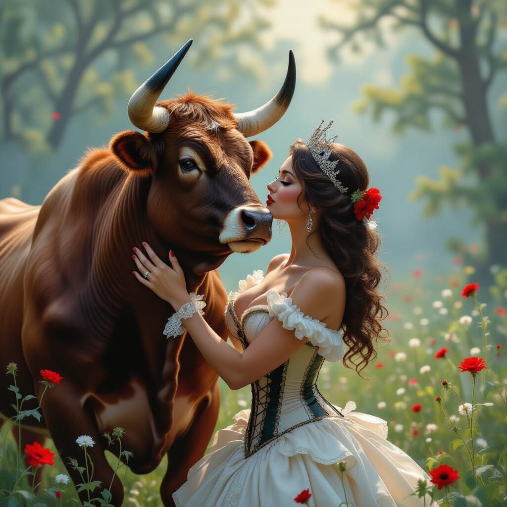 This image depicts a surreal scene in a burlesque setting where a dancer with white lace corsetry kisses a bull. The style is ethereal and hyperdetailed, reminiscent of fantasy art.