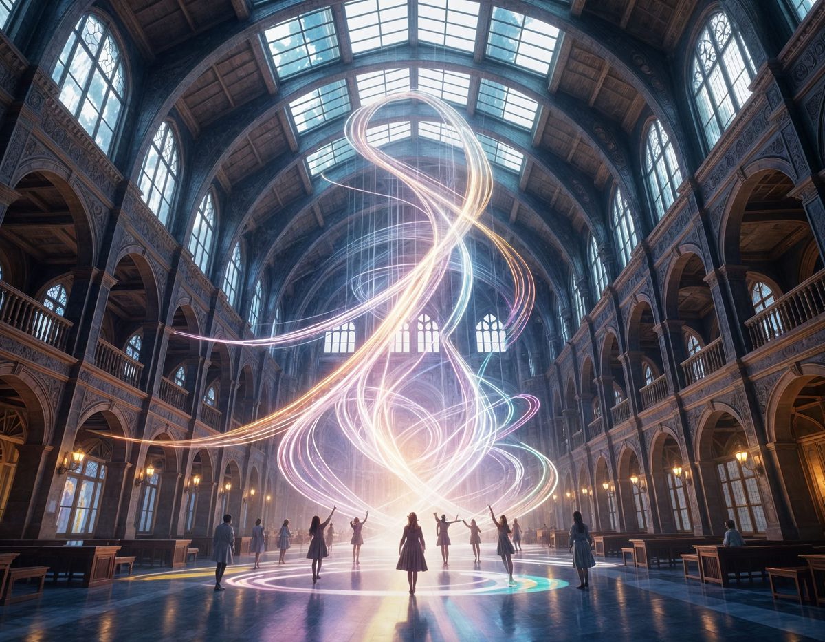 This image depicts a vast Spell School Atrium where students levitate, practicing magic that creates vibrant light trails across a vaulted glass ceiling. Rendered in a luminous fantasy architectural style with dynamic motion and sublime scale.