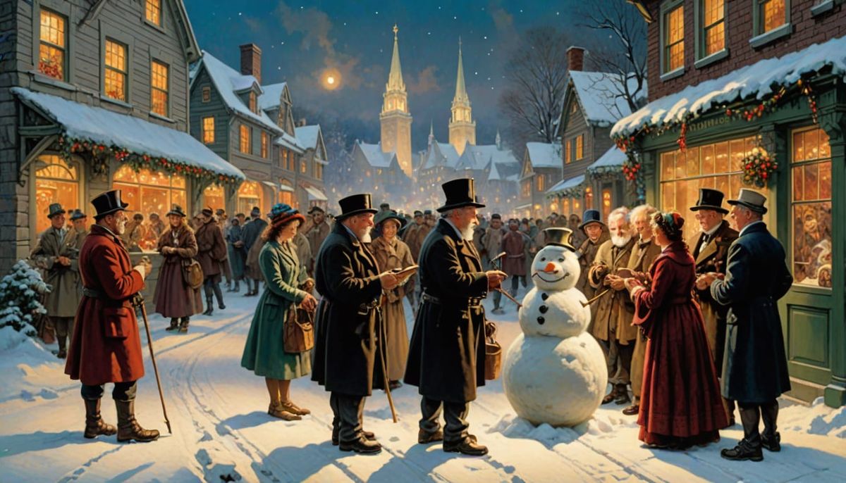 A charming AI-generated scene depicting a festive Christmas village, rendered in the heartwarming, detailed style of classic illustrators.