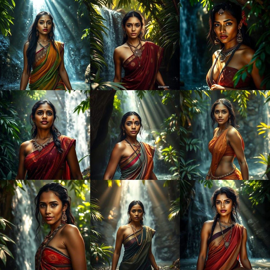 This image shows an athletic Indian woman emerging from a hidden waterfall. Sunlight filters through the jungle canopy, highlighting her traditional jewelry in this photorealistic portrait.