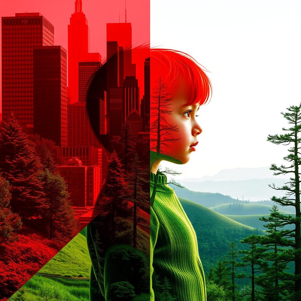 This image shows a child standing between a futuristic cityscape and a serene natural landscape, blending the two worlds in a striking double exposure effect.