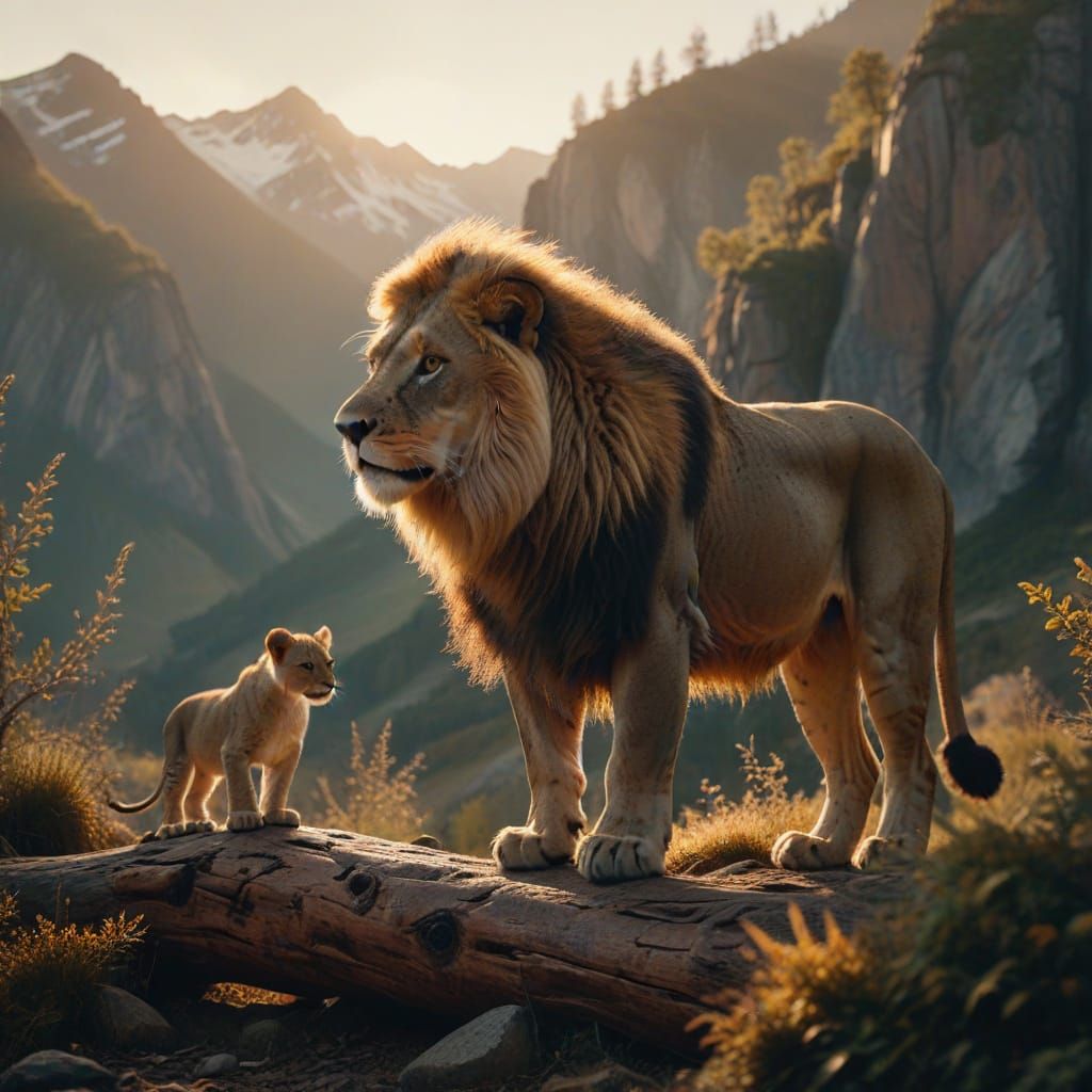 This stunning image captures a wise old lion gazing at a young lion perched on a log, set amidst a breathtaking mountain backdrop with lush foliage and warm, golden tones.