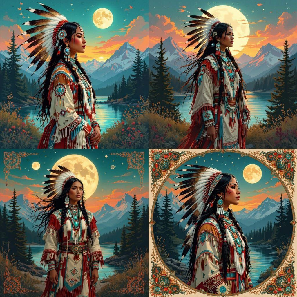 This highly detailed illustration depicts an Indigenous woman embodying the Sacred Feminine, adorned in traditional regalia. Nature elements blend with her, creating a powerful, serene mood in earthy tones.