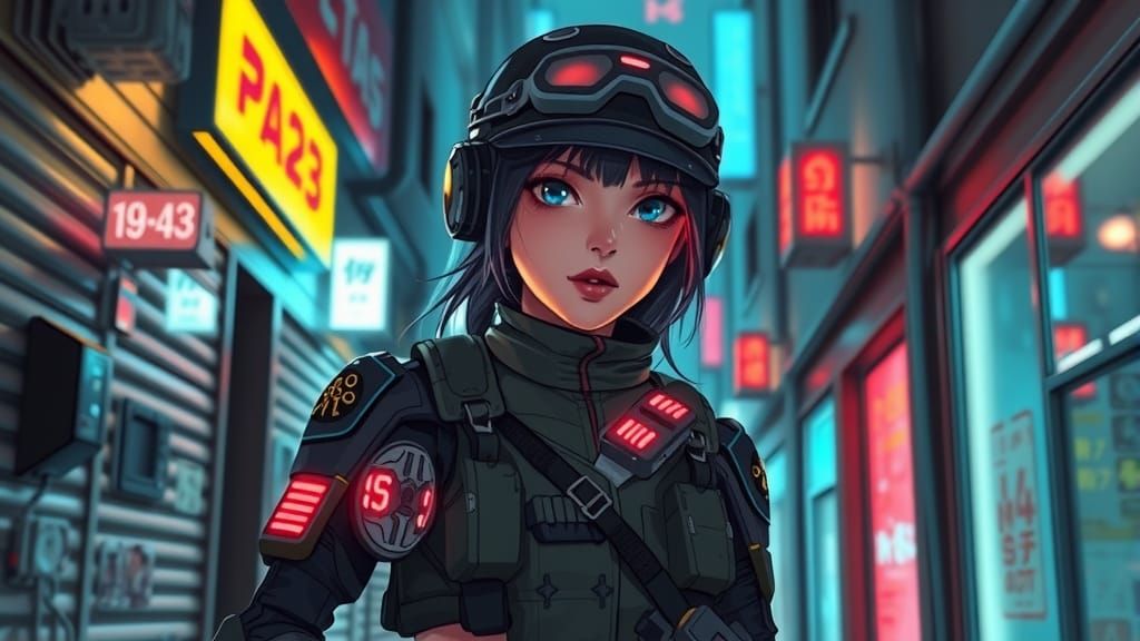 A cel-shaded digital artwork of a ghostly girl in a futuristic military uniform. The cyberpunk scene features neon lights, polished metal, and high-contrast colors in a dramatic, cinematic style.