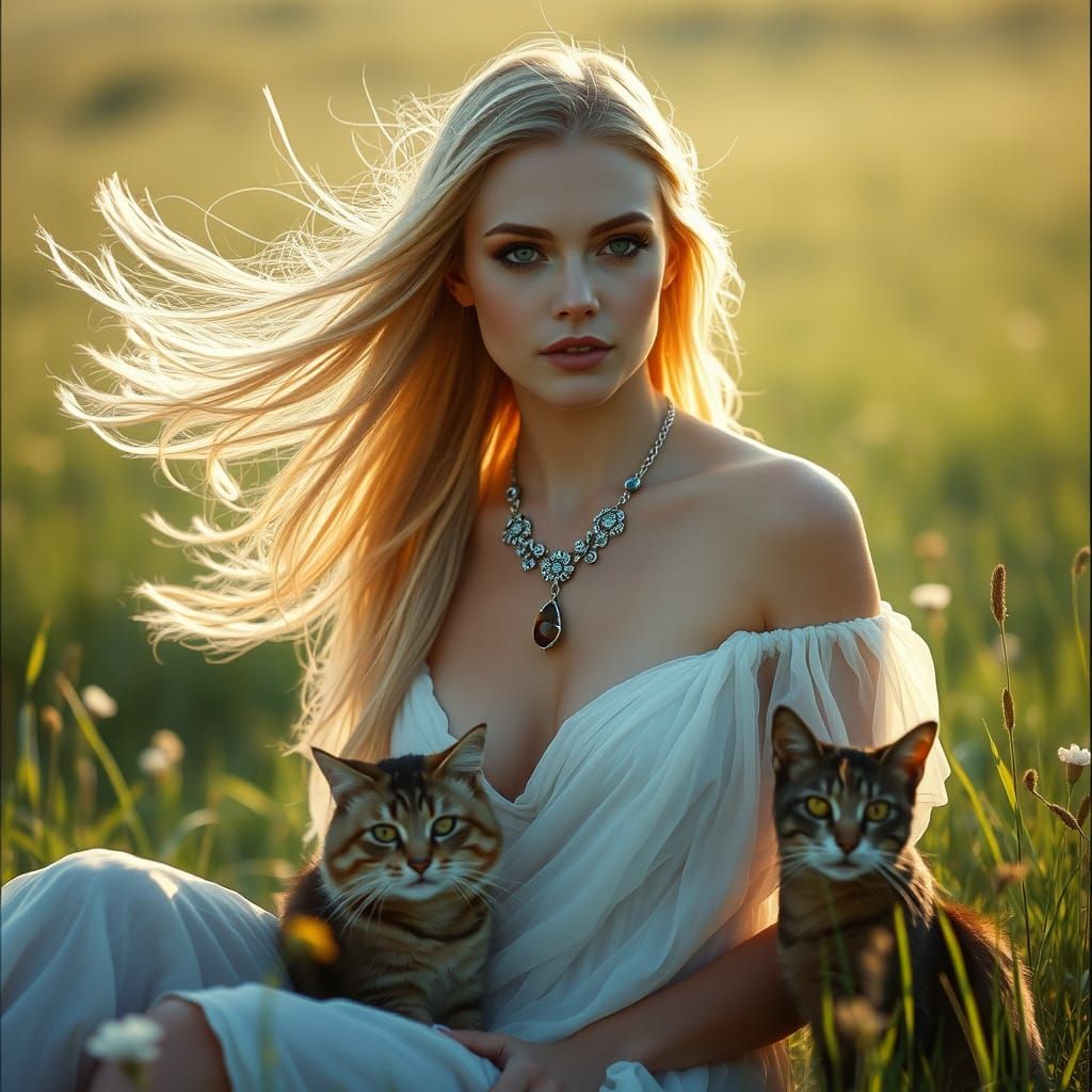This image shows a beautiful female goddess sitting in a serene meadow, surrounded by bright sunlight and a loyal cat. She wears a stunning off-the-shoulder dress and a silver necklace with amber gemstones, her long blonde hair flowing in the wind.