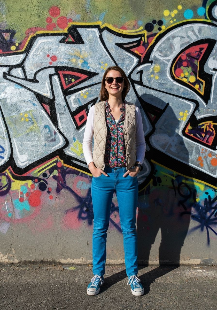 This image shows a Czech woman with long brown hair and freckles smiling shyly while squatting on a boulder. She is wearing bright casual clothing, captured with realistic details and a candid photography aesthetic.