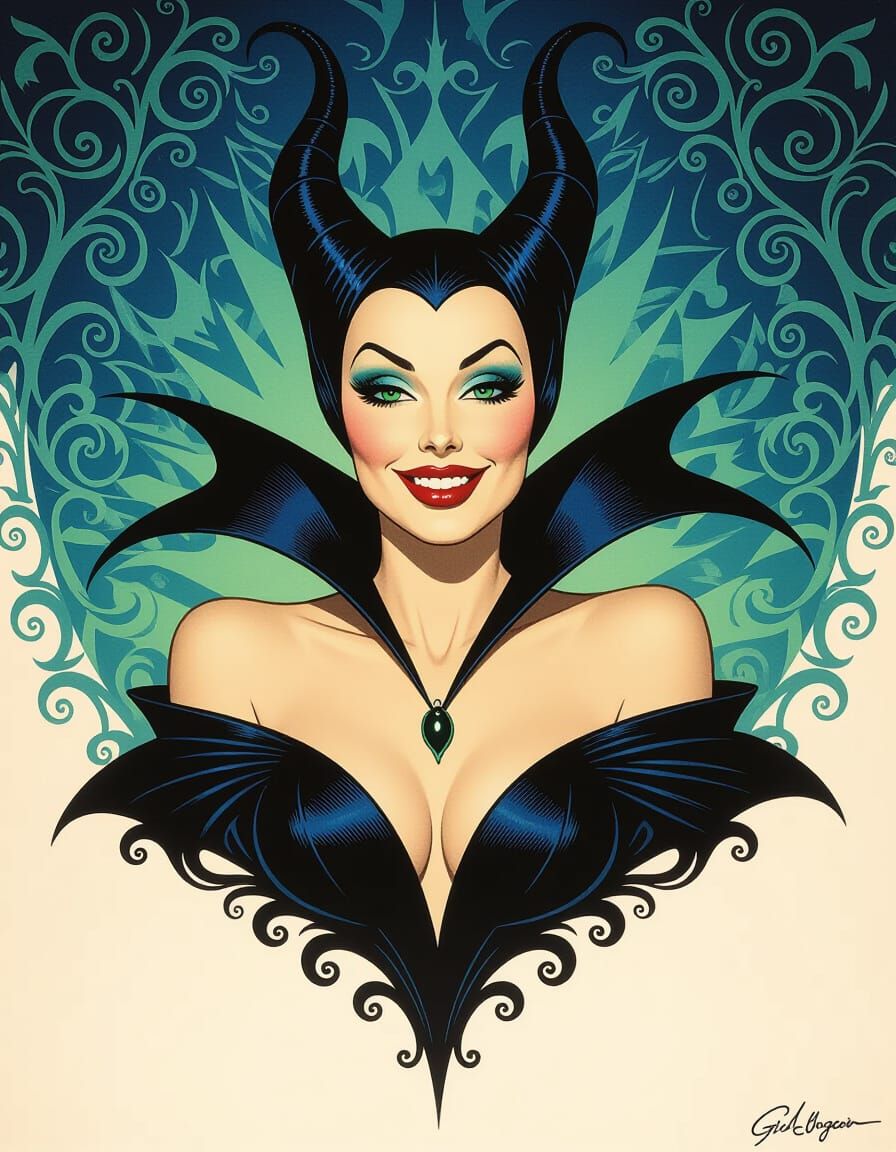 A striking picture of Maleficent in a pin-up style, complete with an evil grin and a detailed dark fantasy backdrop. The image has a vintage aesthetic.
