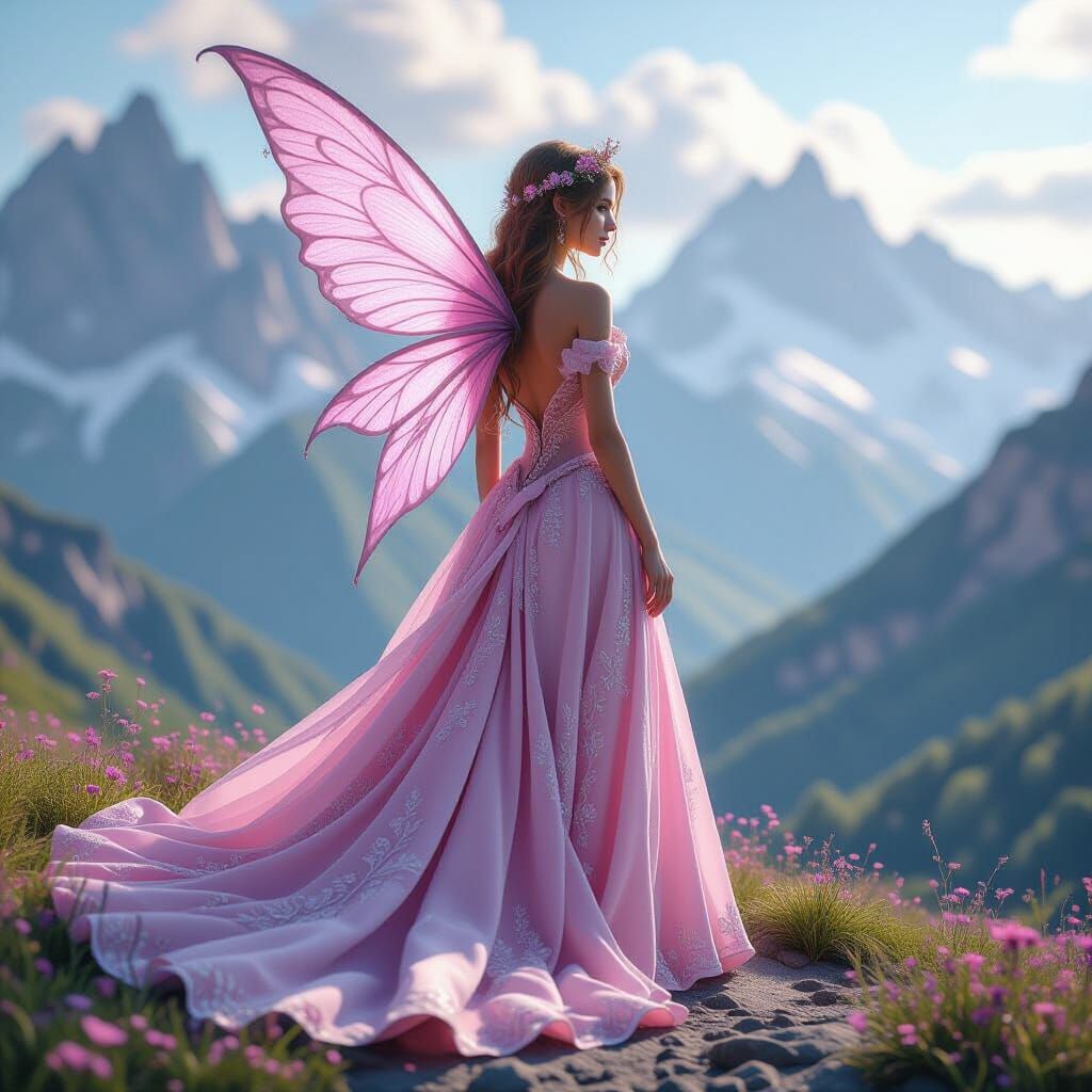 This image shows a beautiful, intricately detailed fairy in a pink nature mountain scene, rendered as a matte painting with deep colors and complementary hues.