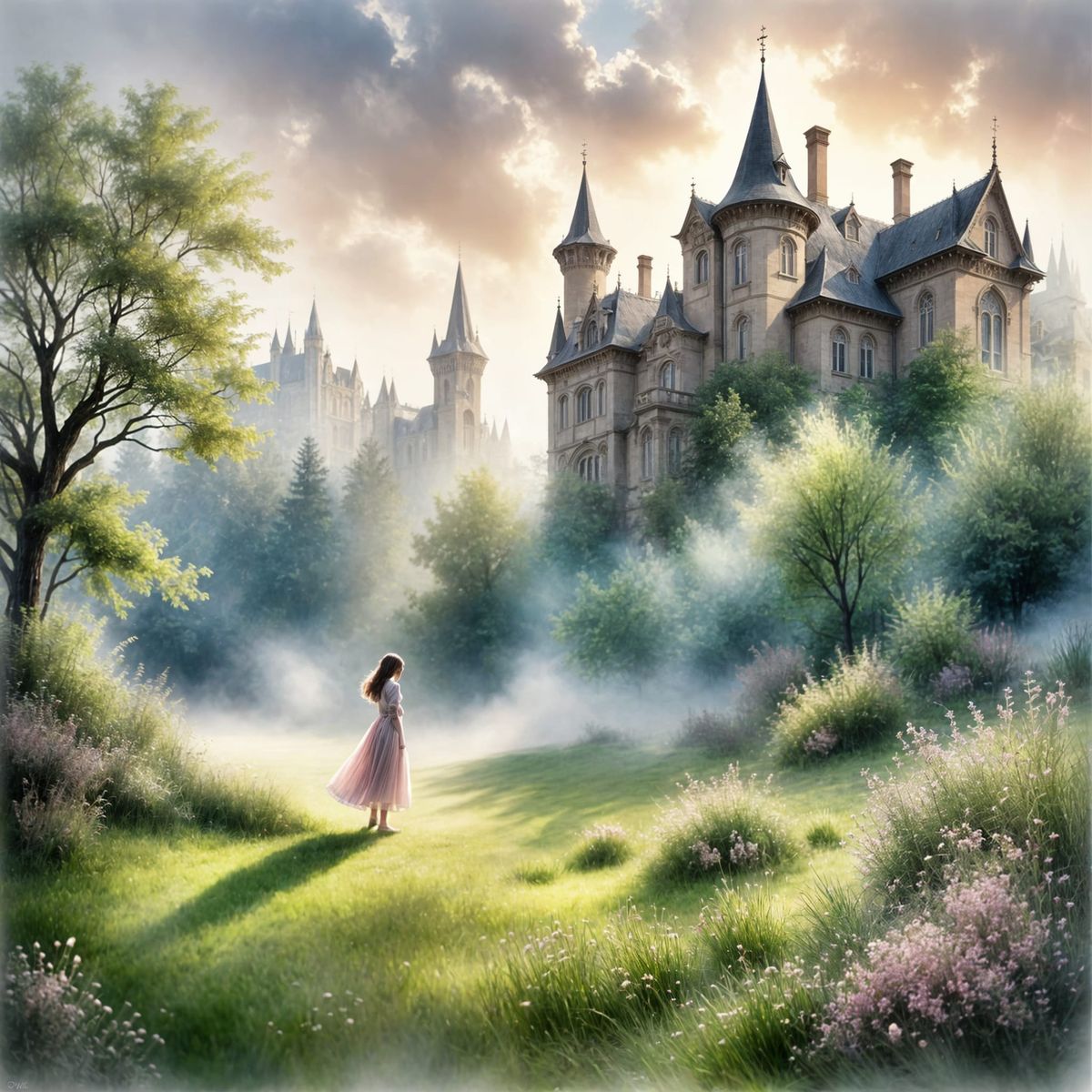 This image depicts a man on a manicured lawn looking at a large gothic castle through morning mist. Sunlight creates ethereal shadows on the grass, rendered in Impressionist style.