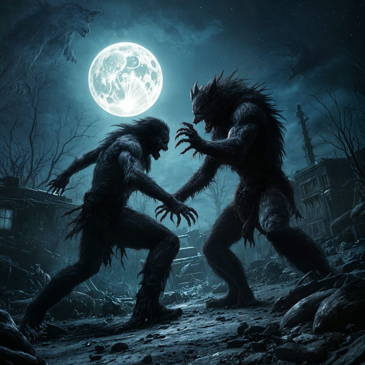 A hyperrealistic image shows a dramatic fight between a werewolf and vampire in a junkyard at night. The scene is lit with chiaroscuro lighting, giving it a cinematic horror aesthetic.
