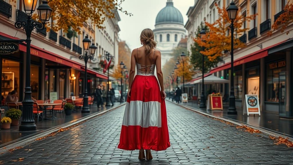 This image shows a woman in a dress resembling the Austrian flag, standing on Vienna's cobblestone streets. The scene is enhanced by vintage lampposts, cafes, fall foliage, and wet reflections, in a style reminiscent of old-world European charm.