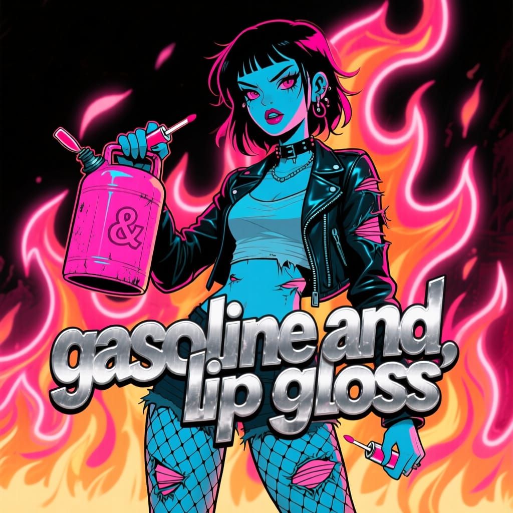 A vibrant cartoon of a rebellious girl with a gas can and lip gloss, set against a neon fire. The artwork features bold lines, bright colors, and a graffiti-style text overlay.