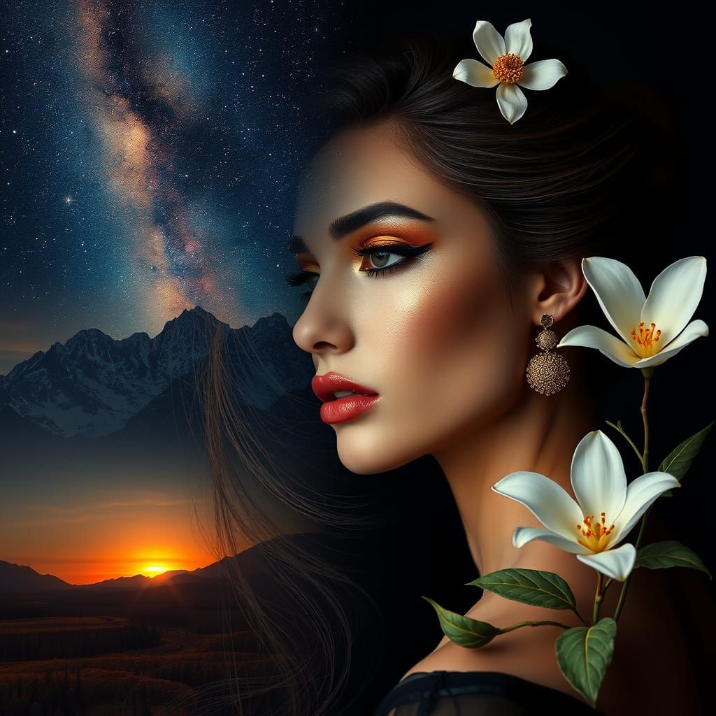 A photorealistic portrait of a woman with striking makeup. The backdrop features a surreal landscape where her hair blends into a starry night, majestic mountains, and a vibrant sunset with golden reflections, creating a dramatic effect.