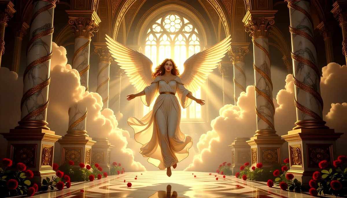 An angelic figure suspended in golden light, surrounded by swirling clouds and fluttering drapery that seem to move with divine energy. Intr...