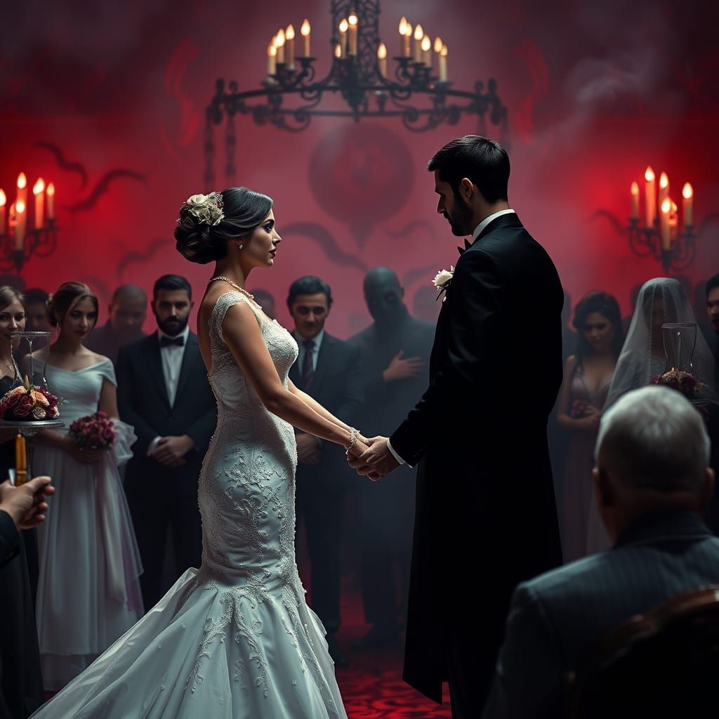 This image shows a vampire bride and human groom holding hands at their wedding. Guests watch in the foreground, with many vampires lurking in the shadows in vivid 8K resolution.