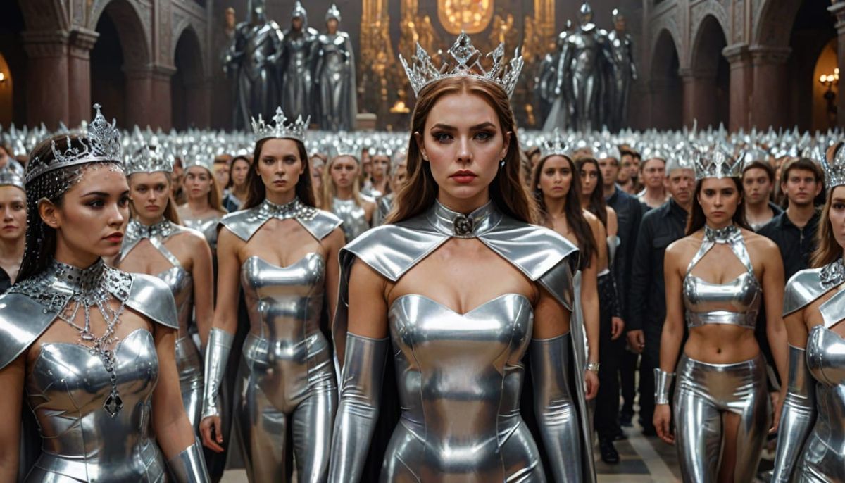 This image shows a young woman in a stunning silver latex outfit, wearing a crown and cape, amidst a crowd of people in latex attire in a vibrant temple setting.