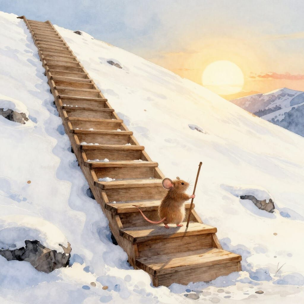 A tiny mouse with a walking stick begins its ascent up a wooden staircase carved into a snowy hill, bathed in the warm light of a sunrise. Painted in a watercolour expressionist style.