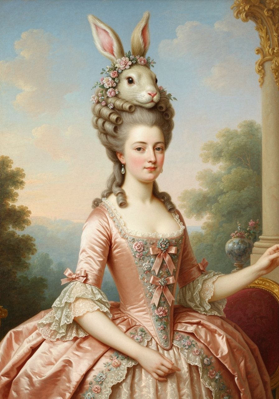 This image shows a Rococo-style portrait of a noblewoman with an elaborate rabbit-shaped hairstyle. She wears a peach silk gown with lace and embroidery against a soft, ornate garden backdrop.