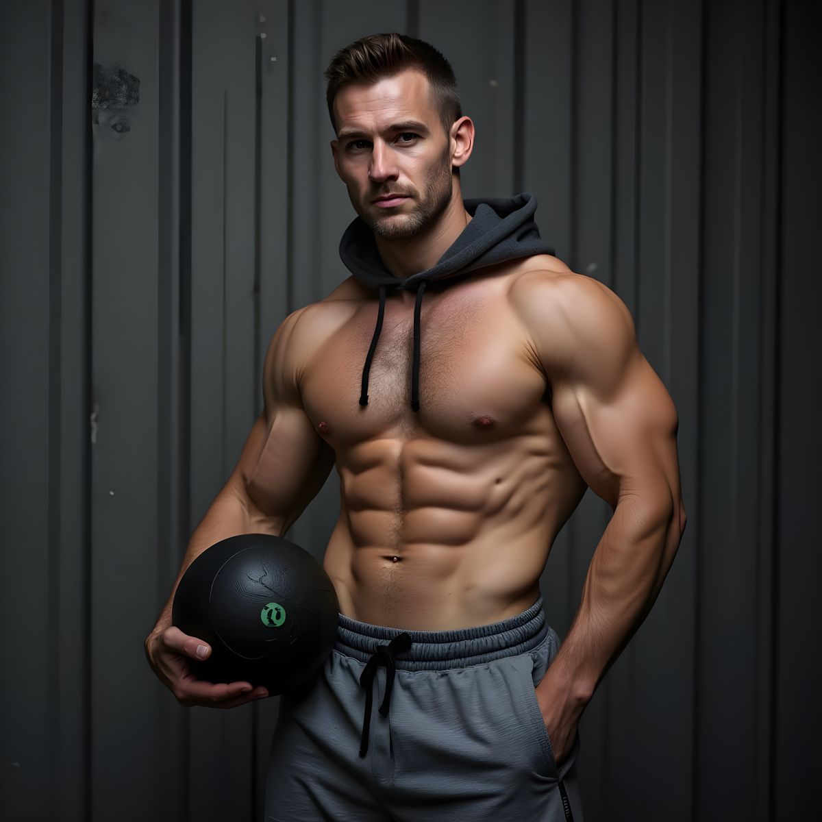This image shows a muscular man with a medicine ball in a gym setting. The photograph is taken from a low angle, emphasizing his physique and the raw intensity of a workout.