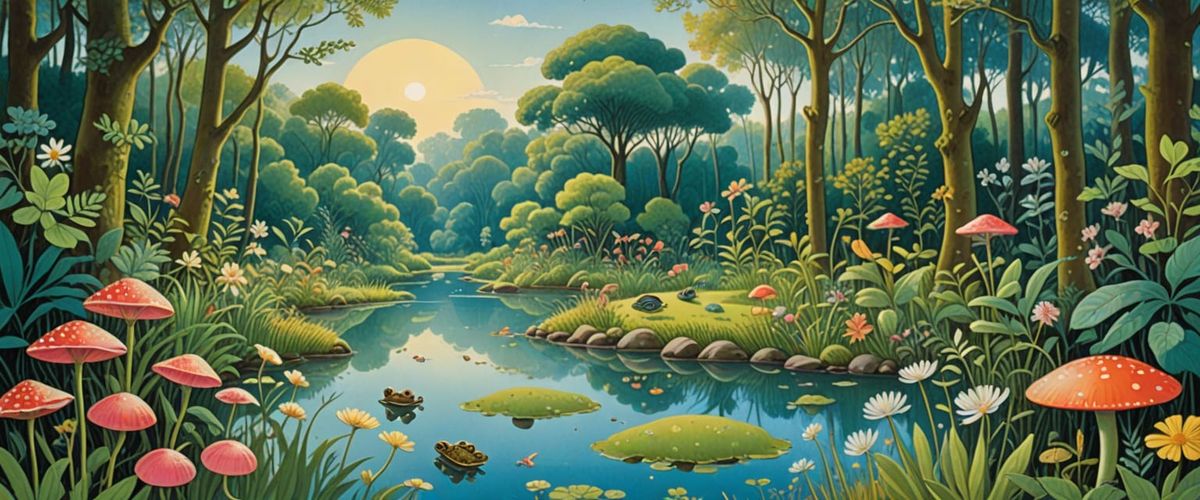 This image depicts a serene, mystical forest glade with lush vegetation and animals. The folk art painting style features soft, dreamy colors, reminiscent of classic animation.