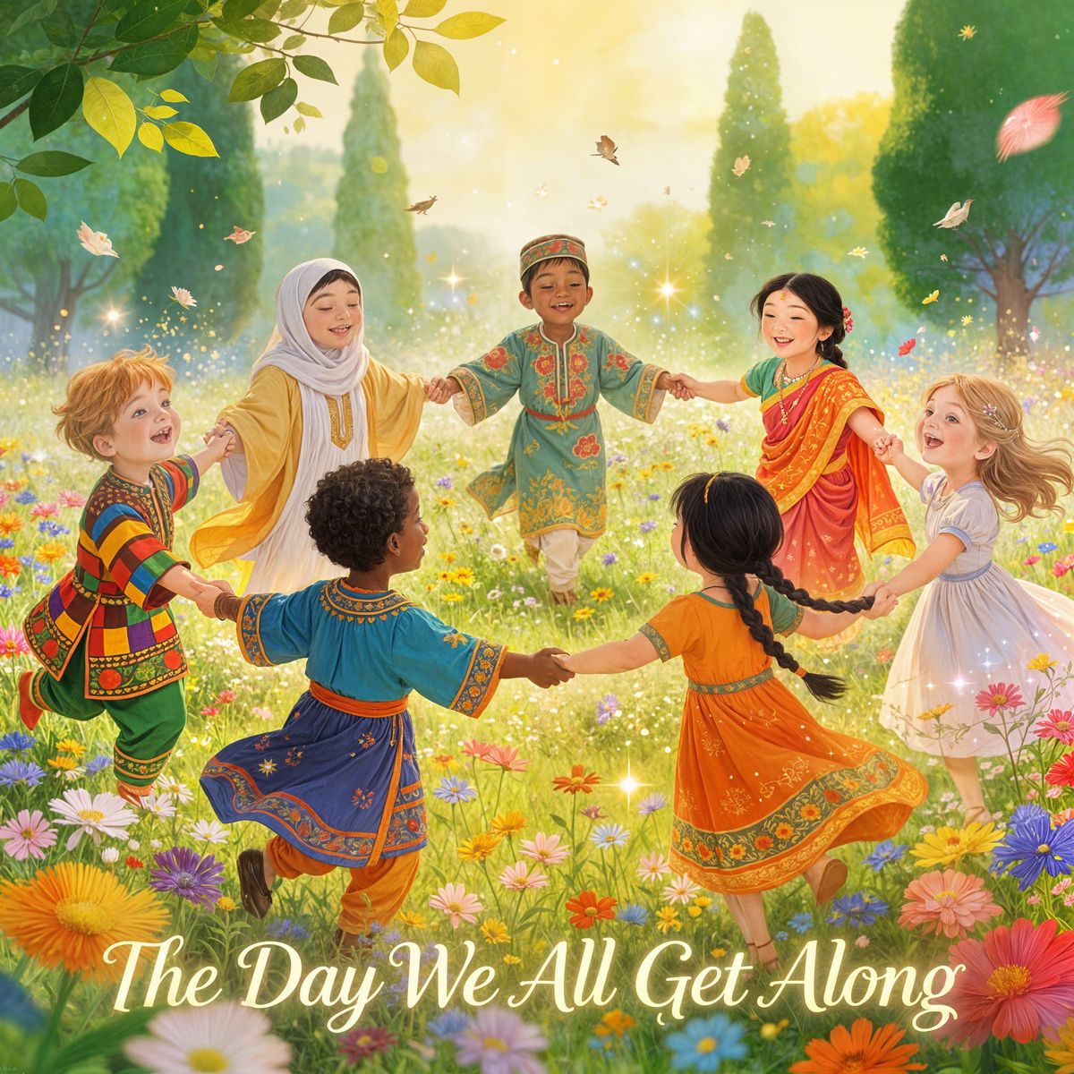 Children of all races, Caucasians, Africans, Arabs, Chinese and Indian , in their traditional costumes, are depicted playing together in a field of wildflowers and trees, their laughter echoing. Their distinct clothing and surroundings blend seamlessly, symbolizing the overcoming of time and societal ...