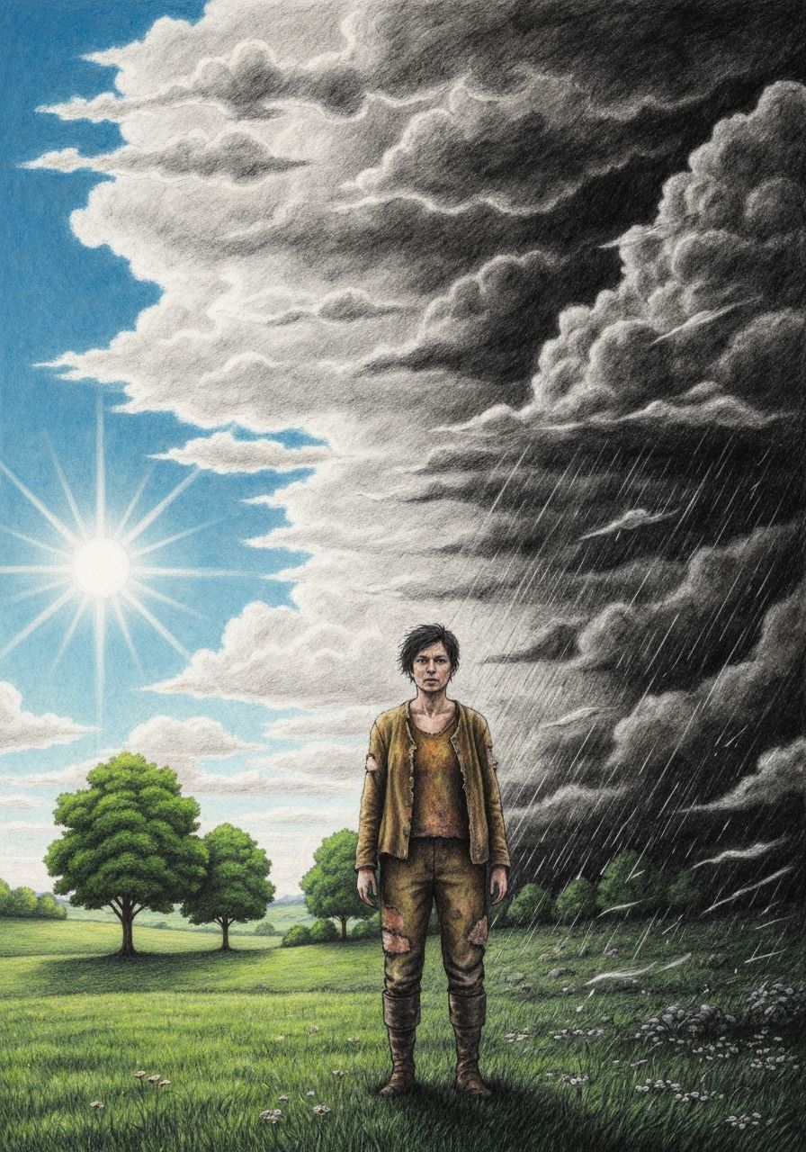 A striking picture of a person standing between two contrasting worlds. On one side, a dark, stormy scene; on the other, a bright, serene landscape. Rendered as a hyperdetailed charcoal drawing.