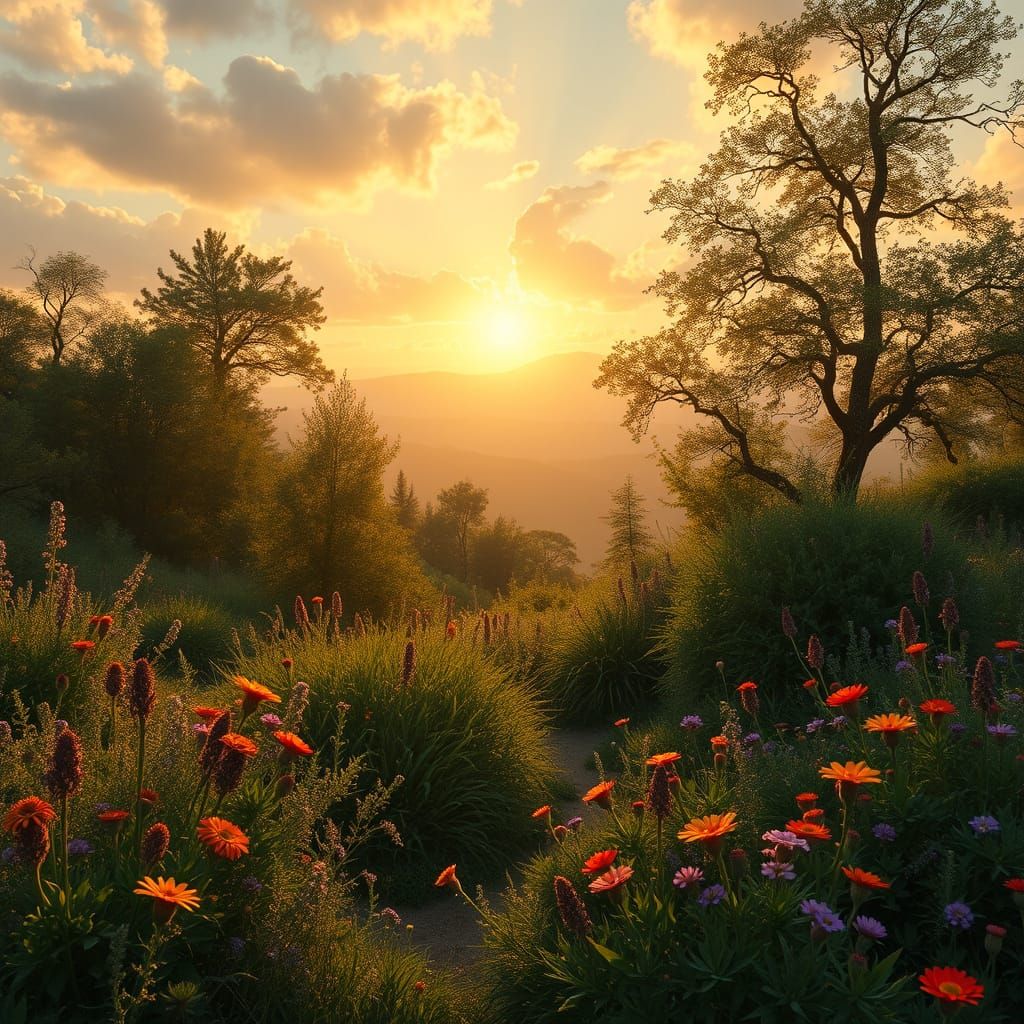 A nostalgic landscape bathed in warm sunlight, evoking the romantic era. Lush greenery and vibrant wildflowers create a dreamlike, whimsical scene in a romantic style.